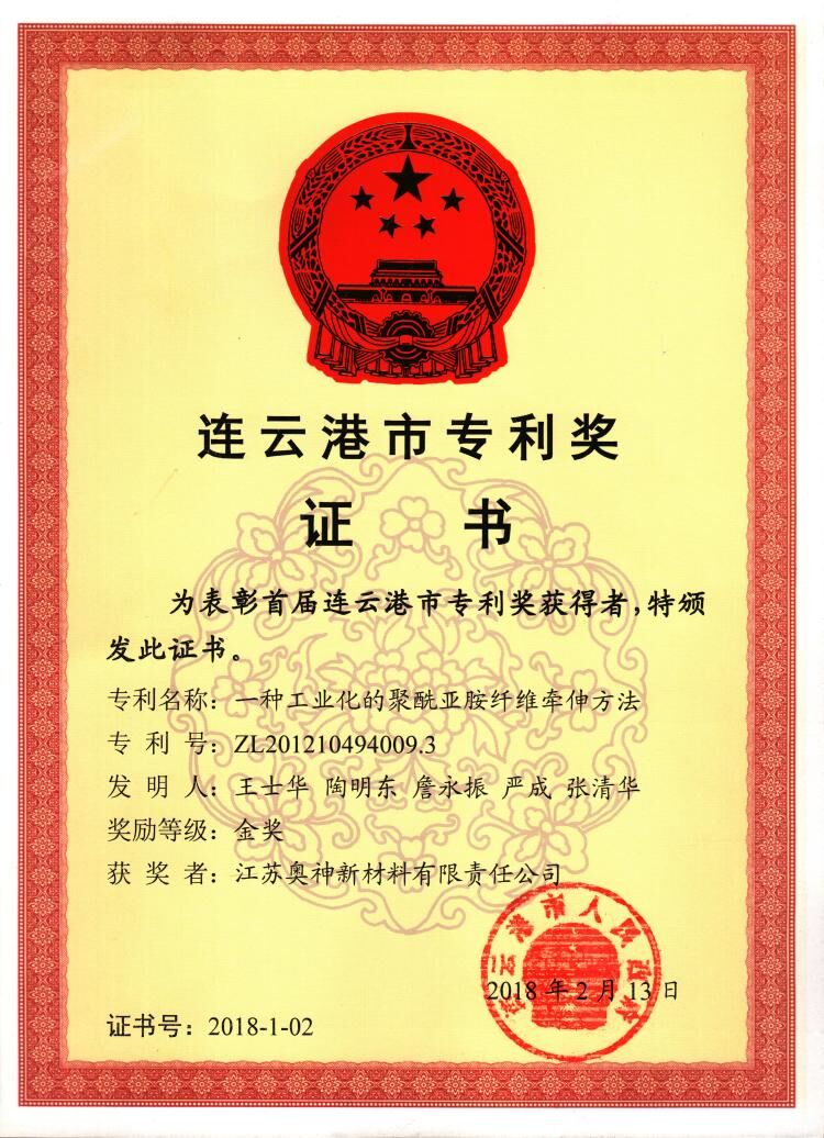 近日,連云港市政府發(fā)文,對首屆連云港市專利獎獲獎項(xiàng)目給予表彰,奧神新材料公司發(fā)明專利“一種工業(yè)化的聚酰亞胺纖維牽伸方法”獲得首屆連云港市專利金獎。據(jù)悉,本屆專利金獎有10項(xiàng)。