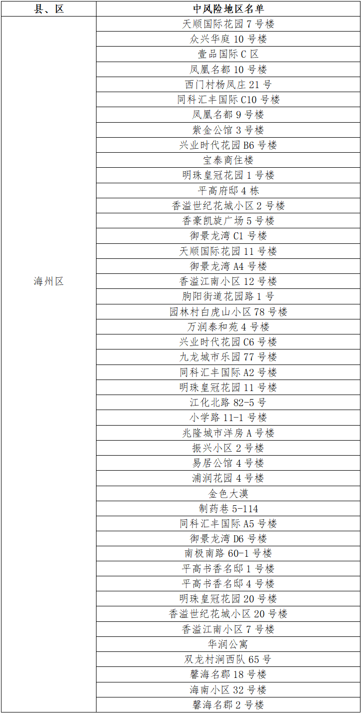 根據(jù)國務(wù)院聯(lián)防聯(lián)控機制有關(guān)規(guī)定,經(jīng)市指揮部研究決定,自發(fā)布之日起,對我市部分區(qū)域疫情風(fēng)險等級進行調(diào)整:海州區(qū)中央華府D1棟、玉蘭國際5號樓、福園名邸3號樓、一品苑44號樓、博威江南明珠苑33號樓、如佳賓館(霞輝路店)、鳳祥銘居7號樓、蒼梧春曉23號樓、龍河小區(qū)25號樓、鷹游水岸花園5號樓、海南小區(qū)34號樓、仕方國際9號樓、茗馨花園18號樓、梧桐藍山晴園7號樓、富強路疏導(dǎo)點旁三合院、百達菲力酒吧、通灌南路66號3棟、極美公寓4號樓、路南街道河運路35號樓、海連中路151號、興城四號公寓8號樓、青年路55號5棟、東方領(lǐng)秀7號樓、寶翔財富廣場3號樓、園林村白虎山組王莊隊13號、津華苑小區(qū)A2號樓、盛世豪庭小區(qū)8號樓、許莊村楊圩北隊51號、振興公寓6號樓、建欣路1號樓、園林村白虎山小區(qū)100號、路南街道東村巷2號樓、建設(shè)中路76-24號由中風(fēng)險地區(qū)調(diào)整為低風(fēng)險地區(qū)。其他地區(qū)風(fēng)險等級不變。調(diào)整后全市現(xiàn)有46個中風(fēng)險地區(qū)。