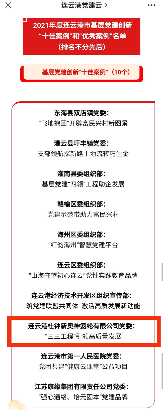 日前,杜鐘氨綸公司《“三三工程”引領(lǐng)高質(zhì)發(fā)展》被市委組織部評為2021年度連云港市基層黨建創(chuàng)新“十佳案例”。