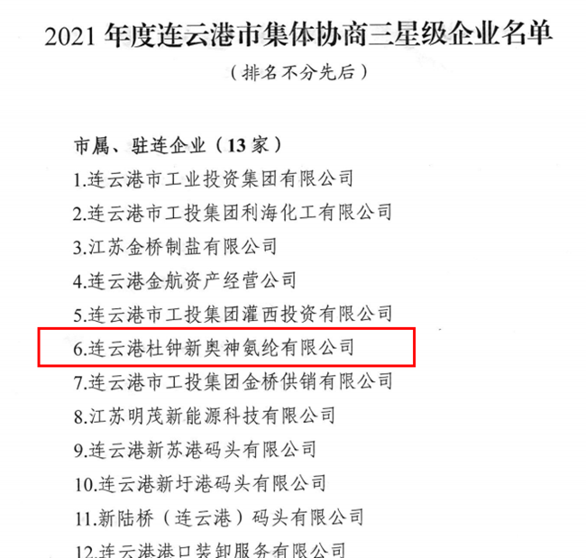 日前,從市協調勞動關系三方委員會辦公室傳來喜訊,2021年度連云港市集體協商三星級企業(yè)評定結果新鮮出爐,杜鐘氨綸公司獲評市級“集體協商三星級企業(yè)”。