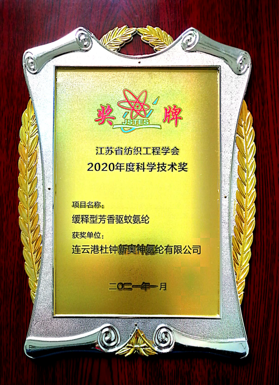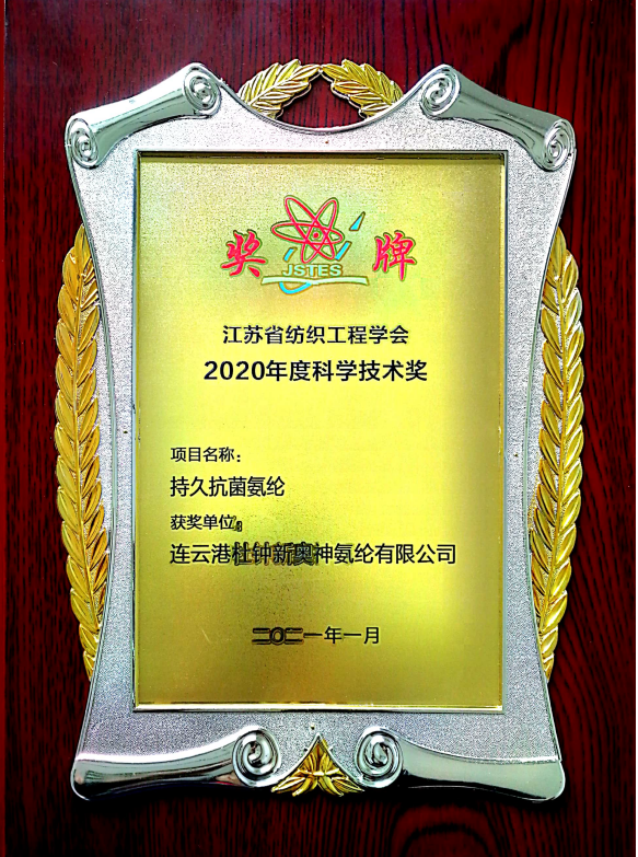 2021年4月24日,2021年度江蘇省紡織工程學(xué)術(shù)年會(huì)和2020年度學(xué)會(huì)畬江頒獎(jiǎng)大會(huì)在南京維景國(guó)際大酒店會(huì)議室舉行。我公司參評(píng)的兩項(xiàng)自主研發(fā)新產(chǎn)品持久抗菌氨綸、緩釋型芳香驅(qū)蚊氨綸被授予2020年度科學(xué)技術(shù)獎(jiǎng)。