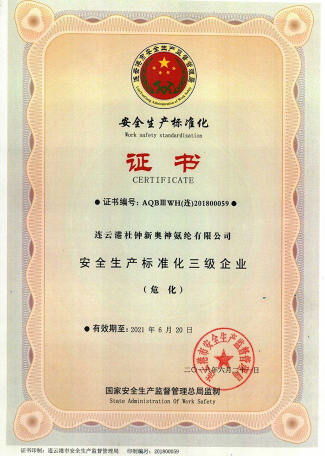 經(jīng)企業(yè)自評、縣區(qū)安監(jiān)局初審、市安監(jiān)局形式審查、考評機構(gòu)考評、市局抽查頒證等程序,最終氨綸公司順利通過評審,取得了安全生產(chǎn)標準化三級企業(yè)(?;┳C書。