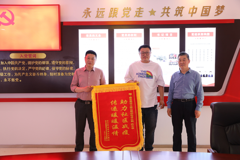 5月5日下午,新東街道新城社區(qū)居委會(huì)工作人員來(lái)到公司,為感謝公司黨員喬中華在該社區(qū)疫情防控期間守護(hù)居民群眾的健康安全,為打贏疫情防控阻擊戰(zhàn)發(fā)揮的積極作用,將寫有“助力社區(qū)戰(zhàn)疫 傳遞暖暖溫情”的錦旗送到公司黨委書記、總經(jīng)理宋晟曄手中。