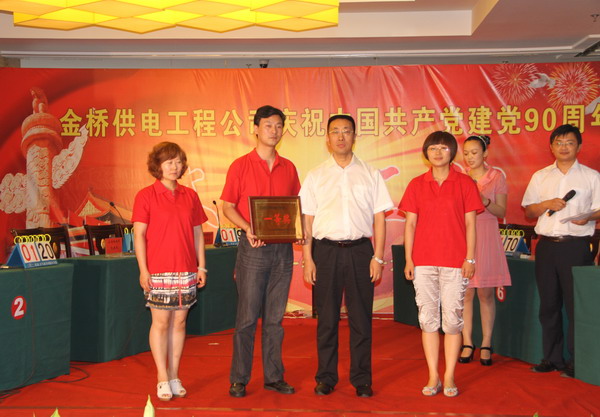 6月29日,公司舉行紀(jì)念建黨90周年知識(shí)搶答賽,共有八支代表隊(duì)參加。經(jīng)過角逐,公司機(jī)關(guān)黨支部代表隊(duì)、灌西供電所黨支部代表隊(duì)和徐圩供電所黨支部代表隊(duì)分獲一、二、三等獎(jiǎng)。(司宣)