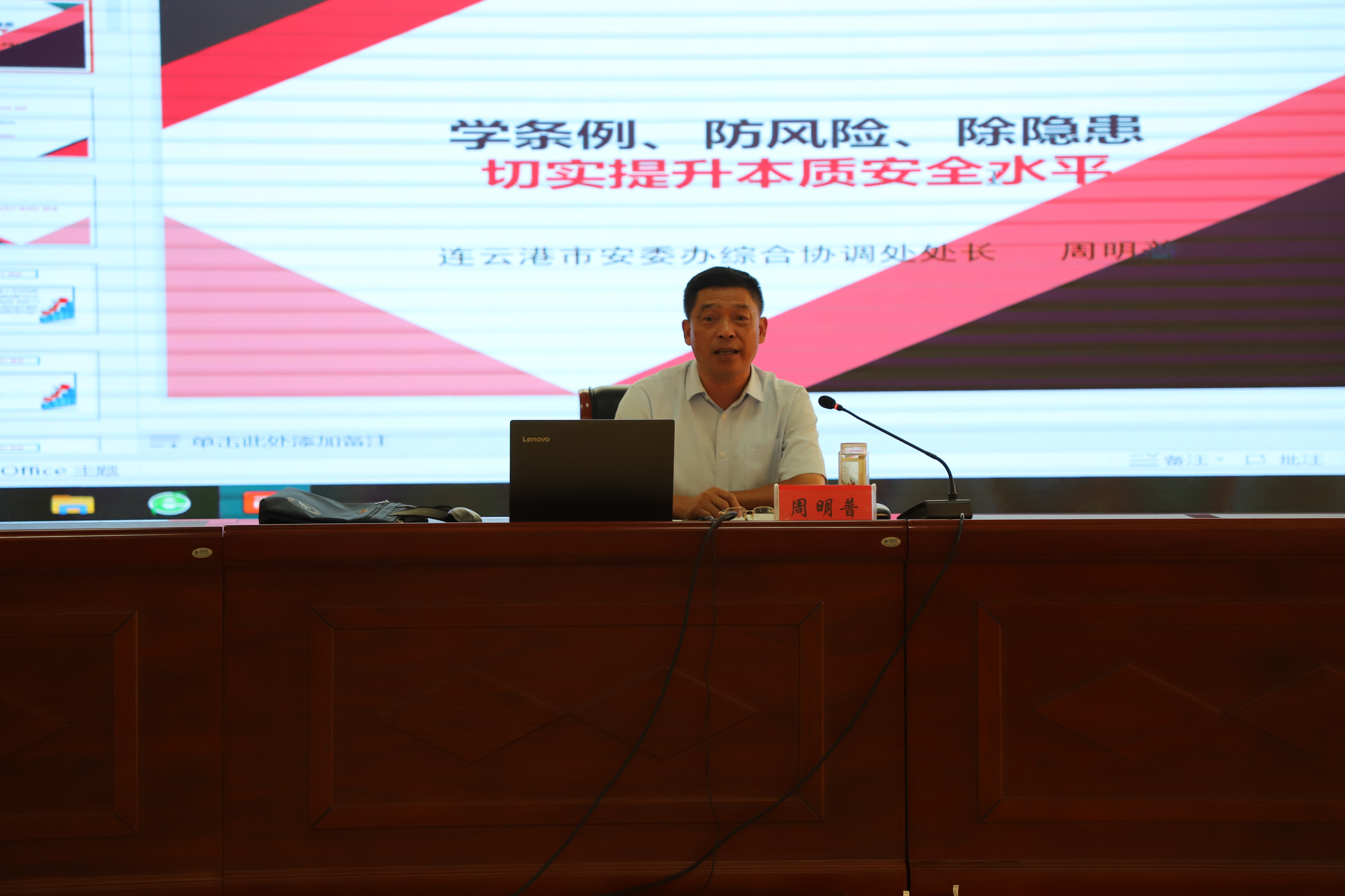 周處長(zhǎng)對(duì)新《江蘇省安全生產(chǎn)條例》、安全生產(chǎn)重大事故隱患排查整治專項(xiàng)行動(dòng)、突出抓好當(dāng)前安全管理重點(diǎn)防范建議作了深入淺出的講解,同時(shí)結(jié)合我公司實(shí)際,提出很多建設(shè)性意見(jiàn)。