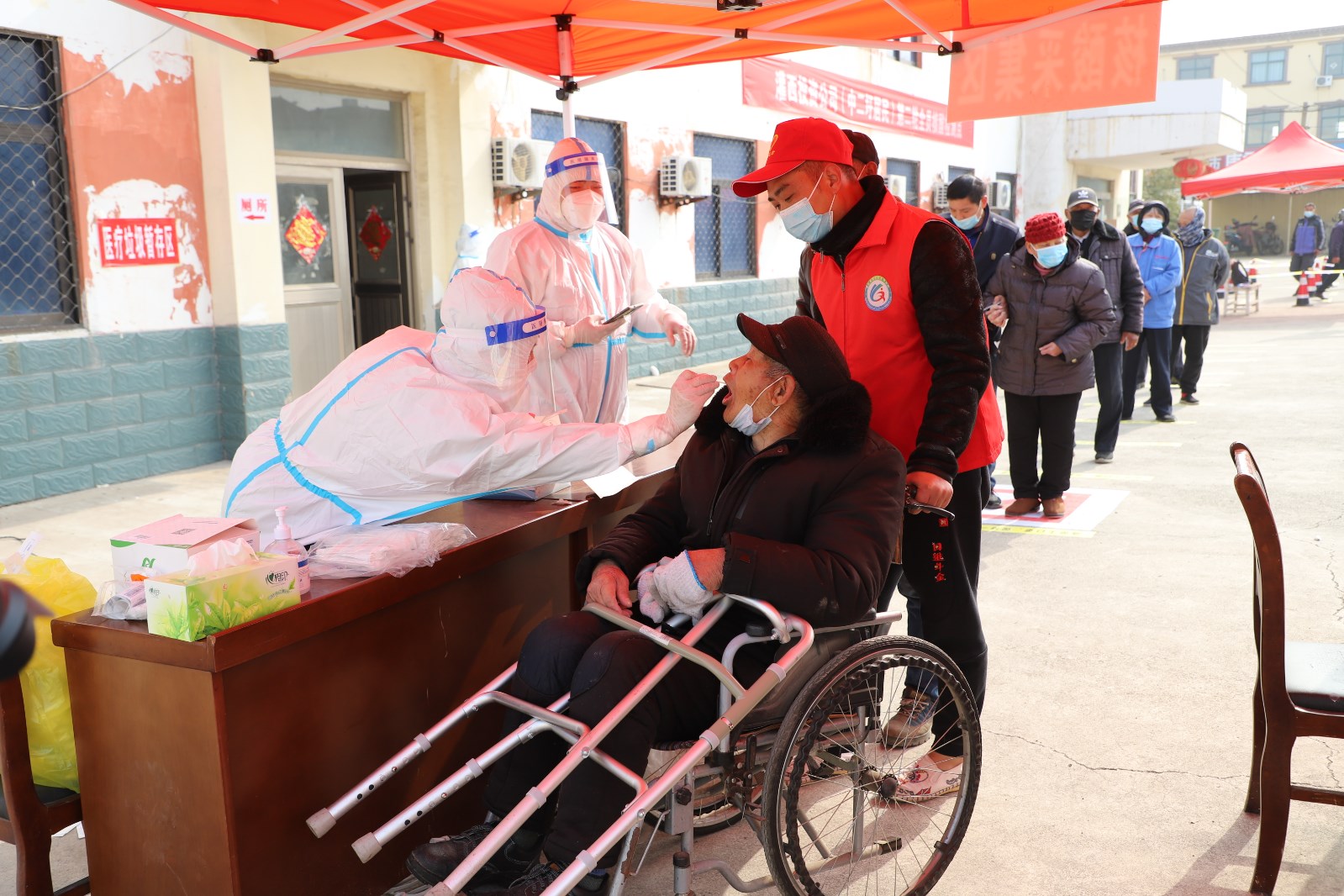 檢測現(xiàn)場,各單位組織黨員先鋒隊成員、社區(qū)志愿者不斷優(yōu)化現(xiàn)場服務(wù),提醒居民群眾提前出示“蘇康碼”,有序排隊,讓等待時間更短一點、人員距離更遠(yuǎn)一點、個人防護更好一點。另一方面,灌西檢測點開設(shè)老者、孕婦、兒童綠色通道,減少這部分人群排隊等候的時間,同時安排志愿者攙扶、幫助不會使用智能手機的老年人,確保他們順利完成核酸檢測。