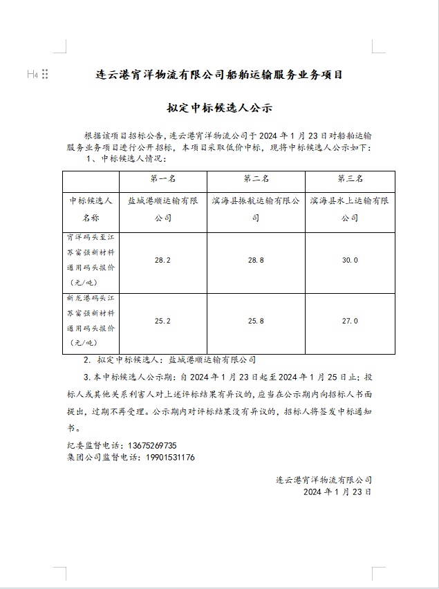 連云港宵洋物流有限公司船舶運輸服務(wù)業(yè)務(wù)項目擬定中標(biāo)候選人公示