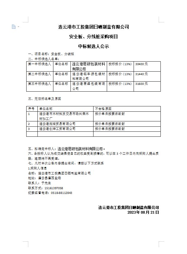 連云港市工投集團日曬制鹽有限公司 安全板、分線樁采購項目 中標候選人公示