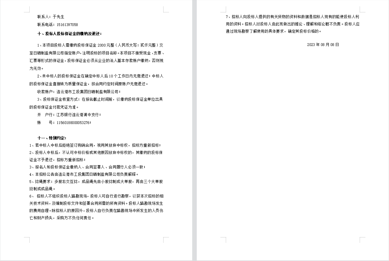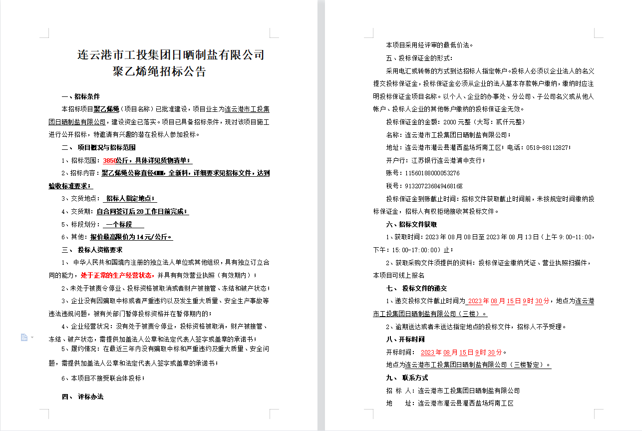 連云港市工投集團日曬制鹽有限公司聚乙烯繩招標公告