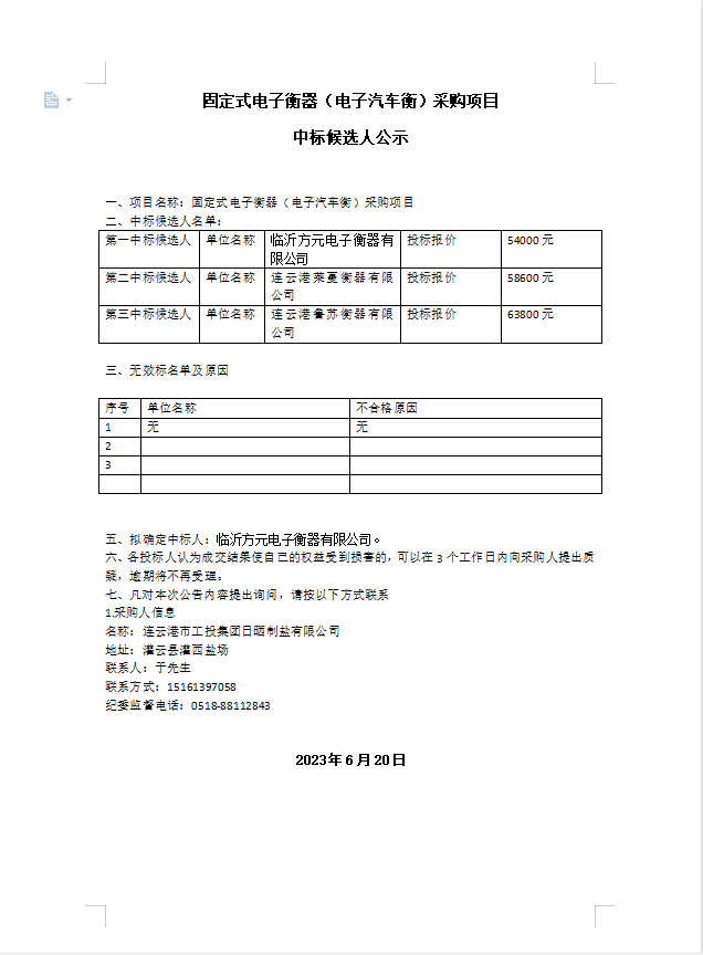 固定式電子衡器(電子汽車衡)采購項目 中標(biāo)候選人公示