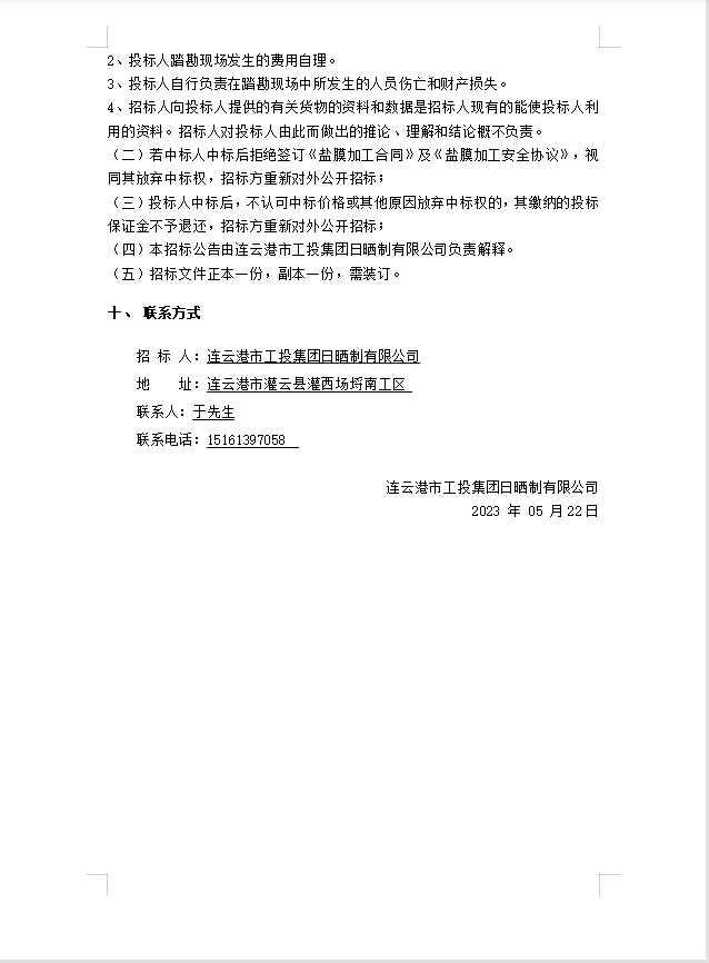 連云港市工投集團(tuán)日曬制鹽有限公司鹽膜壓合加工招標(biāo)公告(二次)