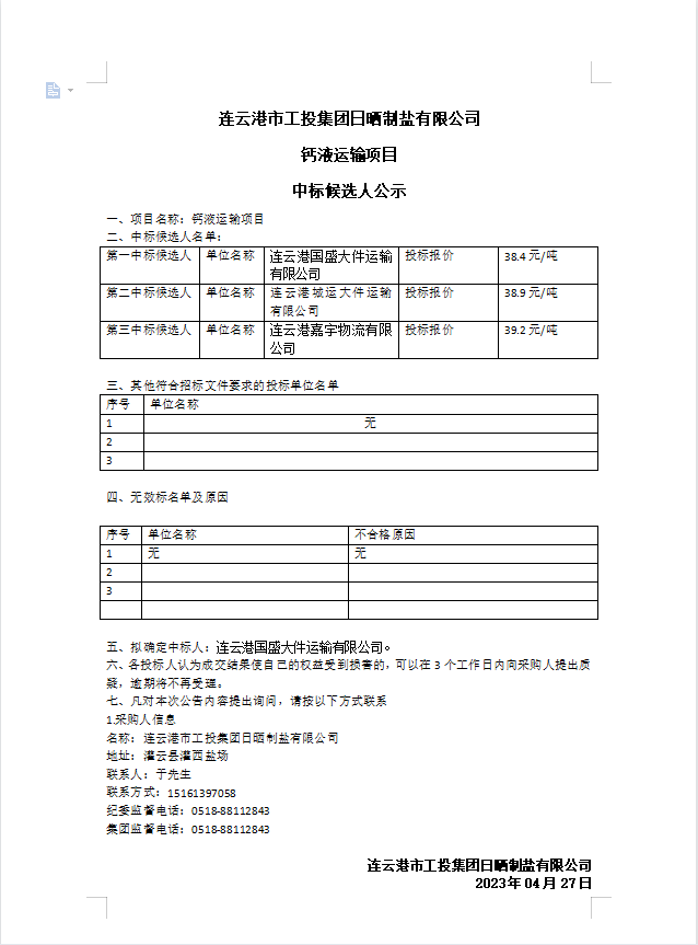 連云港市工投集團(tuán)日曬制鹽有限公司鈣液運(yùn)輸項(xiàng)目中標(biāo)候選人公示