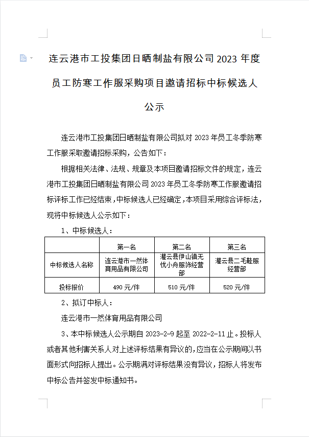 連云港市工投集團(tuán)日曬制鹽有限公司2023年度員工防寒工作服采購(gòu)項(xiàng)目邀請(qǐng)招標(biāo)中標(biāo)候選人公示