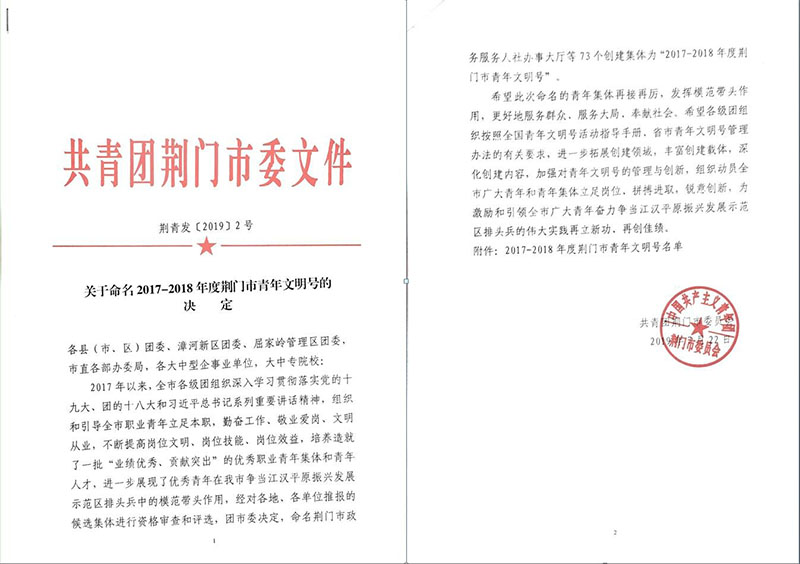 近期,公司收到共青團(tuán)荊門市委員會發(fā)來的獎勵(lì)文件,荊門通航螺旋槳志愿服務(wù)隊(duì)喜獲2017-2018年度荊門市青年文明號榮譽(yù)稱號。這是公司首次獲此殊榮,充分體現(xiàn)了公司青年積極向上、