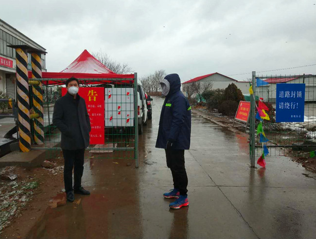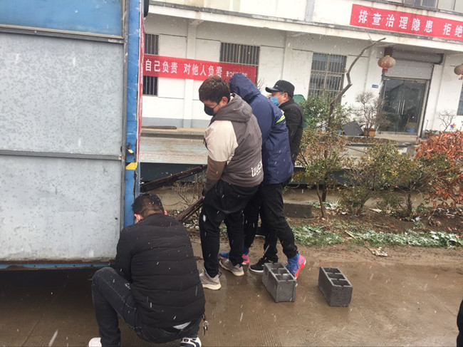 公司黨委書(shū)記、董事長(zhǎng)胡傳法冒雪檢查成業(yè)飼料卡口,胡書(shū)記囑咐在現(xiàn)場(chǎng)值班的團(tuán)青干部防控一線,要?jiǎng)诱娓癫荒芎?,?jiān)決不給外來(lái)車(chē)輛通過(guò)。負(fù)責(zé)這里還有生產(chǎn)生活服務(wù)中心和黃沙分場(chǎng)的全體管理干部,大家都很辛苦,但沒(méi)有埋怨,都在默默地堅(jiān)守崗位,履行職責(zé)。“你不站崗我不站崗,誰(shuí)保衛(wèi)咱大場(chǎng)”他們是這樣說(shuō)也是這樣做的。為了讓值守人員有一個(gè)溫暖的臨時(shí)休憩的場(chǎng)所,泰祥公司將一個(gè)臨時(shí)集裝箱拉到卡口,后勤班的小伙子們,搬運(yùn)調(diào)試固定,絲毫沒(méi)有因?yàn)楹涞奶鞖庥绊懝ぷ鬟M(jìn)度。