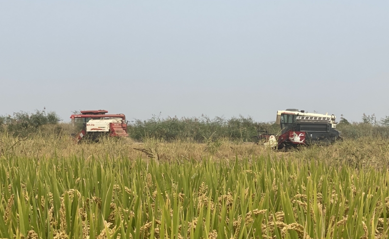 ? ? ? ?10月13日,大新農(nóng)場50余畝稻花香水稻迎來成熟期,開鐮收割。在金色的稻田里,稻谷隨著秋風(fēng)翻起波浪,空氣中裹挾著稻米的清香。轟隆隆的收割機來回穿梭在稻田之中“作畫”,眼前呈現(xiàn)出一派秋收的忙碌景象。(王璐)