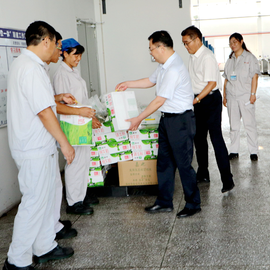 8月1日上午,集團(tuán)公司黨委副書記戴鴻鳴、工會(huì)主席劉承志來我公司慰問生產(chǎn)一線員工,為辛勤工作的員工送來牛奶、綠豆等防暑降溫慰問品。公司黨支部書記、副董事長(zhǎng)鄒德兵,總經(jīng)理韓立新等多位領(lǐng)導(dǎo)陪同。