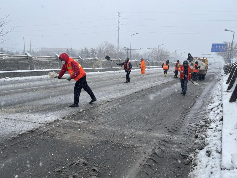自2月2日以來,裕升養(yǎng)護分公司接到掃雪除冰緊急通知后積極響應(yīng),迅速調(diào)配人員和物資,等待暴雪降臨。在負責人霍正鋼的帶領(lǐng)下,公司第一時間成立應(yīng)急搶險隊,這是一支由12名隊員,平均年齡在57歲所組成的隊伍,更是一支“特別能吃苦、特別能奉獻、特別能擔當”的隊伍。雪花于晚次日11點飄然而至,霍正鋼密切關(guān)注雪量以及積雪狀況,并做好指揮部署,同時通知各隊員立即開展道路掃雪除冰工作。