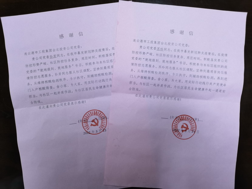 “臺(tái)北投資公司的黨員同志們視疫情防控為己任,服從調(diào)度安排,站好每一班崗,不僅認(rèn)真履行防控職責(zé),又創(chuàng)新開(kāi)展疫情防控教育宣傳、便民服務(wù)等多項(xiàng)活動(dòng),成為我們社區(qū)防疫攻堅(jiān)的主力軍?!?/span>3月25日,收到開(kāi)發(fā)區(qū)猴嘴街道昌圩社區(qū)送來(lái)的一份特殊的“禮物”— 一封疫情防控感謝信,感謝臺(tái)北投資公司黨員蘇玲、孫芳等同志在新冠肺炎疫情防控的關(guān)鍵階段挺身而出、伸出援手,參與協(xié)助社區(qū)的疫情防控工作。