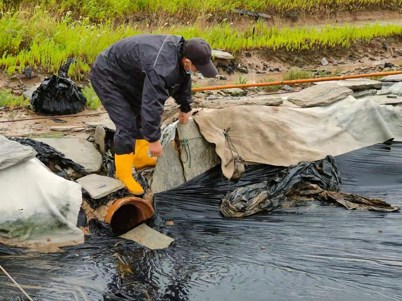 為了確保養(yǎng)殖池塘的安穩(wěn)度訊,養(yǎng)殖辦工作人員頂著大雨查看池塘水位和圍堰抗臺(tái)風(fēng)情況.