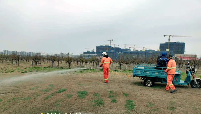 積極澆灌返青水。當(dāng)前,地溫回升快,苗木易萌芽,該班組采用“人工+機(jī)械”相結(jié)合的方式,全面啟動(dòng)返青水集中澆灌工作,重點(diǎn)對(duì)園區(qū)喬木、果木、草坪等進(jìn)行全面灌溉,促進(jìn)苗木、草坪返青發(fā)芽。按照分種類、合理澆灌的原則,采取集中澆灌的方式最大限度減緩晝夜溫差對(duì)綠化植物的影響,入春后共澆水100余次,對(duì)落羽杉圓動(dòng)力灌根2000棵,對(duì)大樹澆水1500棵,綠化澆水約30000平方米。